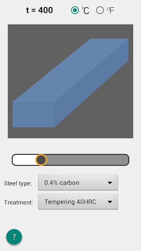 B5. "Thermomètre visuel pour acier" - contient une simulation du réchauffeur de barre en acier et montre des couleurs de teinte et de chaleur radiante réalistes pour l'acier. Cet écran pourrait être utilisé pour déterminer la température de l’acier par "œil", ce qui est suffisant pour de nombreux amateurs de travail des métaux. Il contient des données de référence pour le durcissement et le revenu des aciers génériques (basé sur le% de carbone contenu).