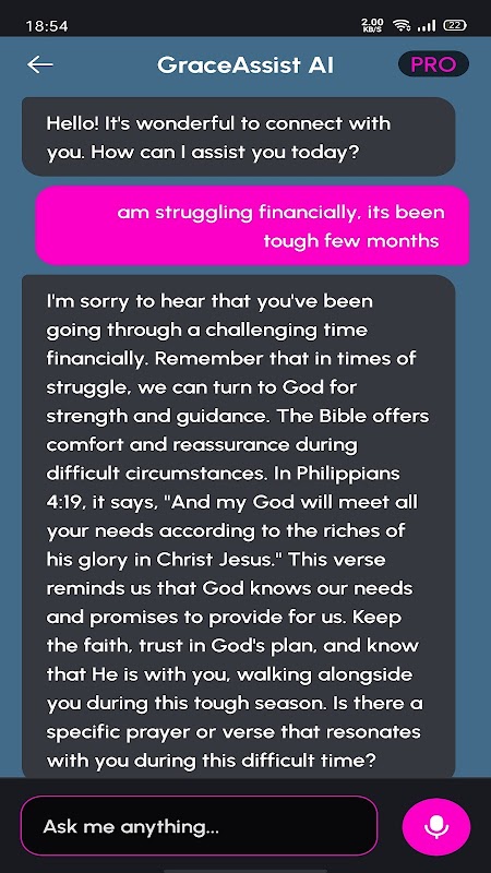 GraceAssist est plus qu'un simple chatbot ; c'est votre fidèle compagnon pour naviguer dans les défis et les joies de la vie à travers le prisme de la foi chrétienne. Téléchargez GraceAssist aujourd'hui et embarquez pour un voyage de croissance et de découverte spirituelles.