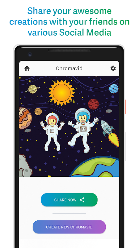 Partagez vos créations avec vos amis sur diverses plateformes de médias sociaux. Vous pouvez même enregistrer votre Chromavid sur le stockage de votre appareil.