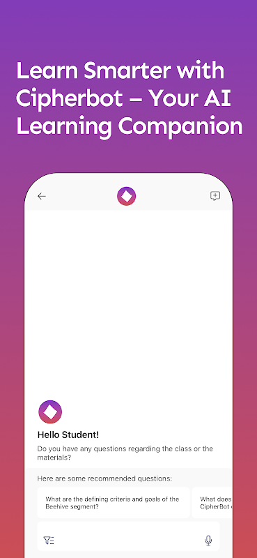 Cipherbot est une application basée sur l'IA qui vous aide à optimiser vos cours. Posez simplement des questions et Cipherbot vous donne des réponses claires et précises, basées sur les ressources téléchargées par votre enseignant. C'est comme discuter avec votre classe, à tout moment et en tout lieu.