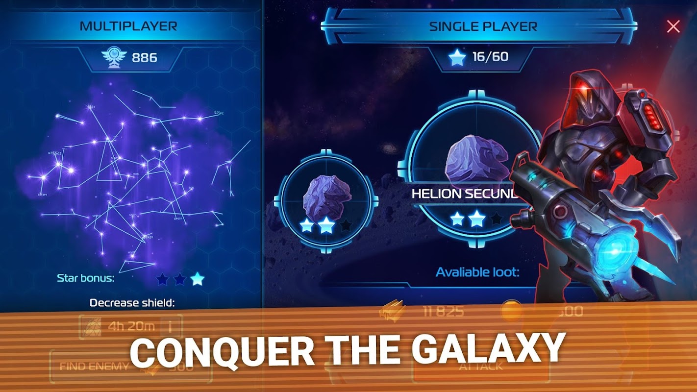 Ask your friend to be an ally or get into the clan to fight other friends in PVP war. Level up your hero and unit and attack the enemy together with friends to win epic rewards! Invent new special strategy and conquer a cunning AI in a single player campaign. Upgrade your troop to fight and defend against any enemy. Trusted friends and your spaceship is all you need. New rewards await brave galaxy explorers in this fun free to play mobile space RTS. Become addicted to the best free online mobile game on the planet. The fate of the galaxy lies upon your shoulders!