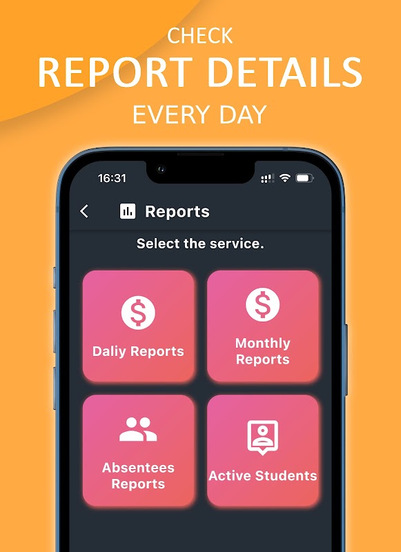 Besoin de générer des rapports détaillés sur les paiements, les étudiants absents ou les étudiants actifs ? Aucun problème! Notre application a ce qu'il vous faut. Et avec notre appareil POS, vous pouvez même obtenir un récapitulatif des paiements quotidiens.