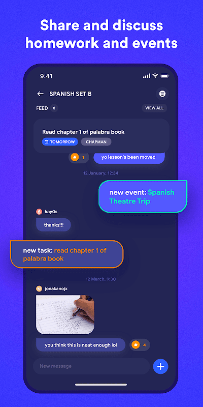 Désormais complet avec des sous-chats pour discuter de devoirs et d'événements spécifiques au sein d'une classe qui sont automatiquement archivés au fil du temps. Envoyez et accédez également à des fichiers tels que des images et des PDF dans des discussions de groupe !