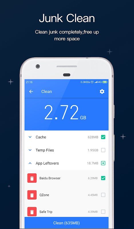 Avec notre puissant moteur d'analyse, le nettoyeur aide les utilisateurs à analyser tout le cache, le journal, les fichiers temporaires, l'image inutile, l'apk, les déchets résiduels pour libérer de l'espace de stockage sur votre appareil.