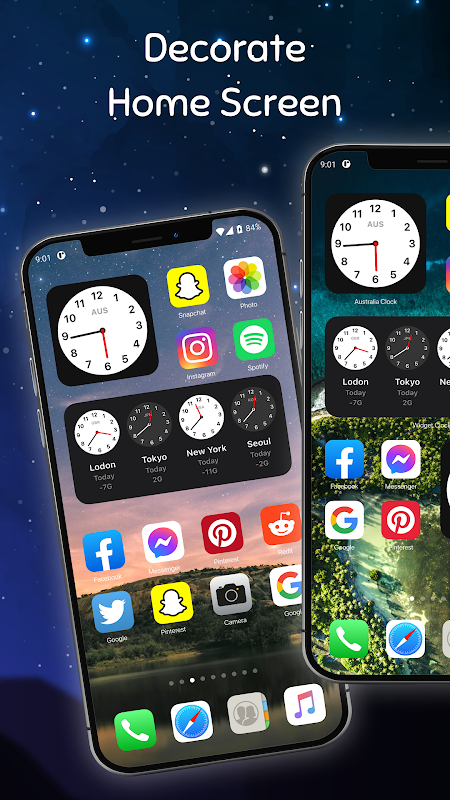 Clock Widget iOS 15 est conçu de la même manière que les widgets du téléphone 13. Vous pouvez suivre l'heure dans les villes de votre choix dans un style de design comme le Phone 13.