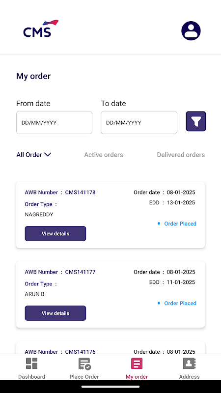 ● Le tableau de bord présente deux options principales : Commande en cours : affiche les commandes actives ou en cours. Commande livrée : affiche les commandes terminées et livrées. Les clients peuvent sélectionner l'une ou l'autre option pour accéder à l'écran correspondant pour plus de détails.