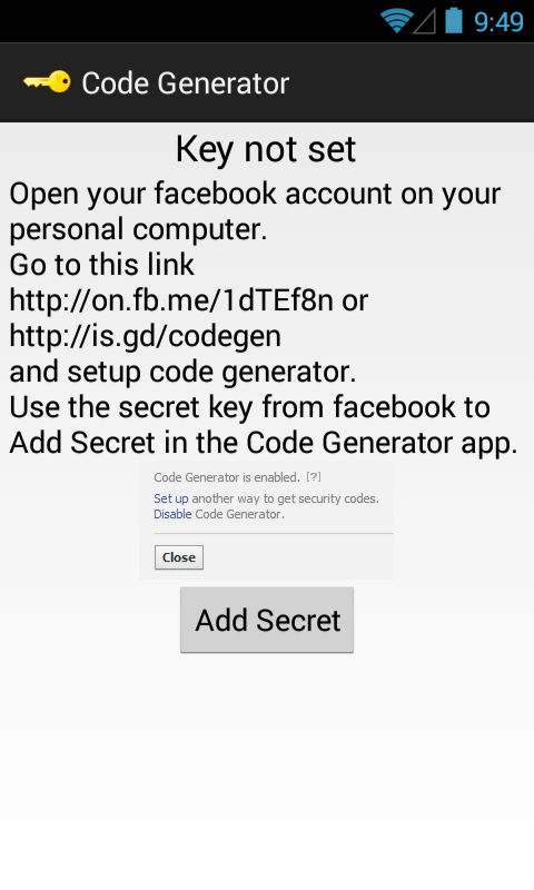 Code Generator est une application de génération de code basée sur le temps, pas seulement pour Facebook. Il crée un code de connexion unique toutes les 30 secondes, même lorsque vous n'êtes pas connecté à Internet. Vous disposez donc toujours d'un code lorsque vous en avez besoin. Si les autorisations de connexion sont activées, vous pouvez utiliser Générateur de code au lieu d'attendre un message texte avec votre code de connexion.