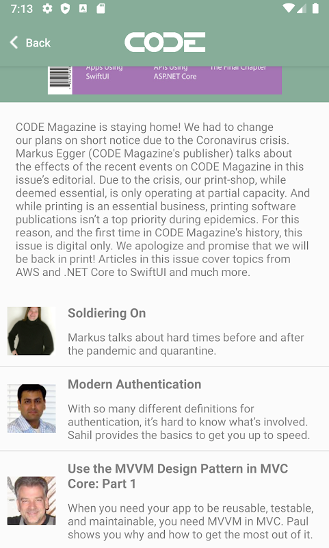 Cette application permet aux abonnés de CODE Magazine de lire le magazine sur leur appareil.