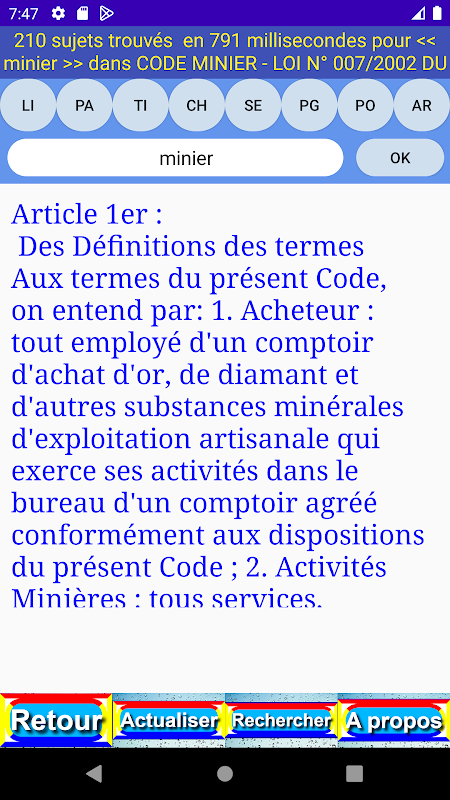 Le critère saisi est retrouvé aisément dans les différents niveaux (livre (LI), partie (PA), titre (TI), chapitre (CH), section (SE), paragraphe (PG), point (PO), article (AR) et contenu (OK)) de la publication.