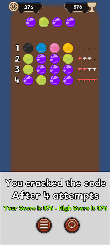 In the spirit of the classic game from the 1970's, in CodeBreaker, the goal is to figure out the hidden color code. Depending on your difficulty setting, the code can be either 4 or 5 colors.