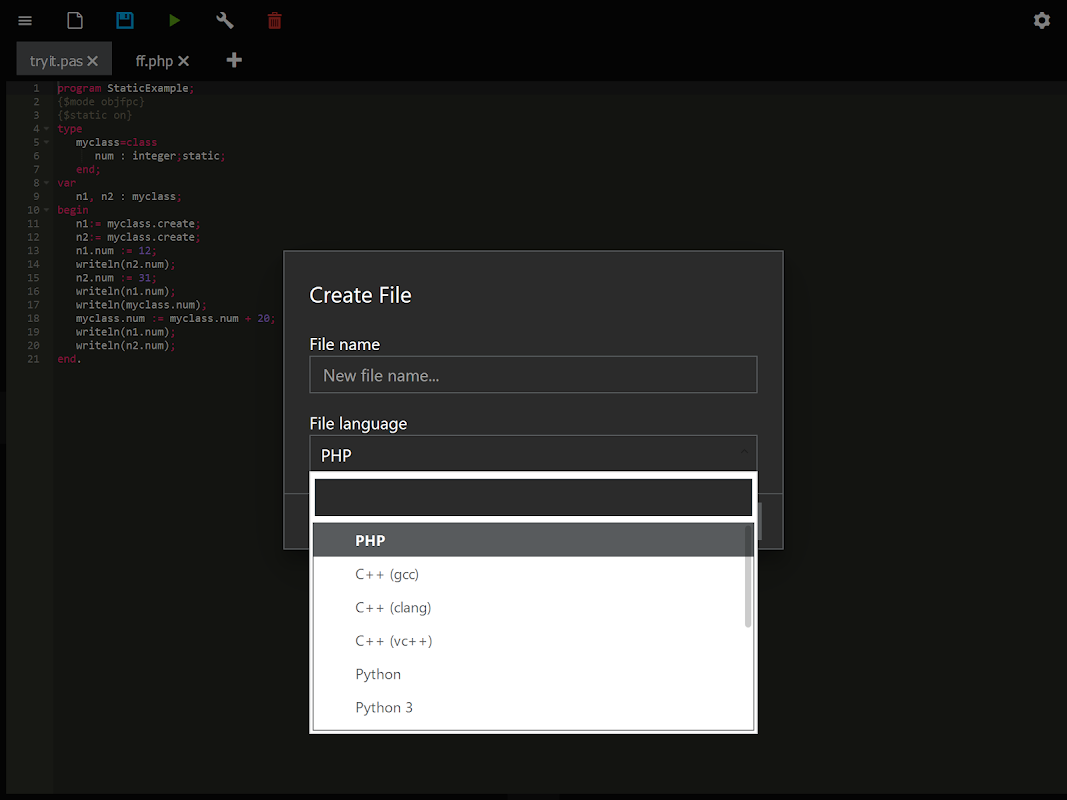 codeIDE allows you to write & run Pascal, PHP, C, C++, ... on Phone
