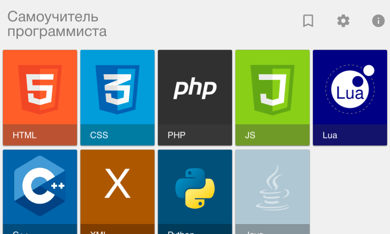 Кроме учебников, в приложении есть справочники которые содержат полные перечни HTML тегов, CSS атрибутов, JS и PHP функций.