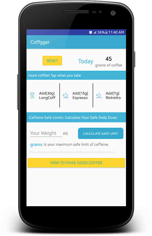 5 -Coffgger | enregistreur de café et la calculatrice de caféine contient une calculatrice utile pour la quantité de caféine autorisée scientifiquement sur la base de votre poids car ceci est considéré comme une consultation scientifique, mais cette calculatrice ne remplace pas les conseils médicaux professionnels.