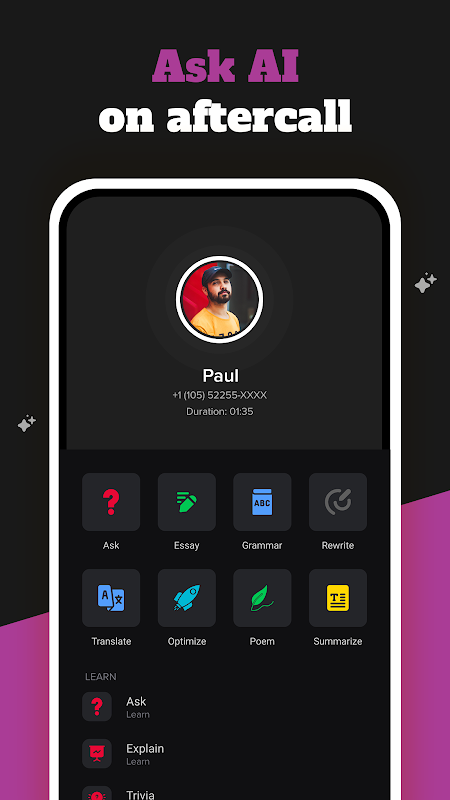 Cette application innovante introduit une fonctionnalité d'après-appel révolutionnaire qui offre aux utilisateurs une recherche rapide par IA pour des réponses immédiates aux questions à partir des informations issues des conversations téléphoniques. Grâce à cette fonctionnalité, vous ne manquerez jamais un battement après un appel tant que votre mémoire est fraîche.