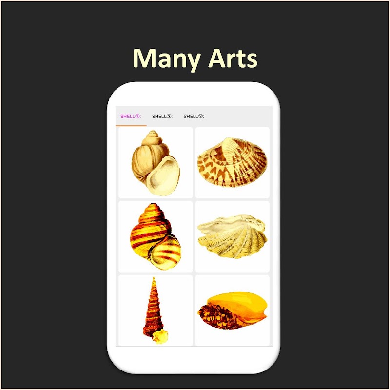 Tout le monde, des adultes aux enfants, peut profiter des arts coquillages. Vous pouvez créer des arts originaux avec un appareil photo. Faisons et partageons vos arts avec votre famille ou vos amis.