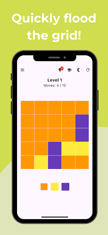 Libérez le stratège qui sommeille en vous et éclaboussez la grille de couleurs vibrantes dans ce jeu de puzzle addictif et hallucinant ! Commencez en haut à gauche et regardez les couleurs que vous avez choisies envahir le plateau, remplissant chaque recoin sans dépasser le nombre de coups requis. Chaque coup compte : planifiez soigneusement vos choix de couleurs et trouvez le chemin parfait pour terminer le puzzle en un minimum de coups !