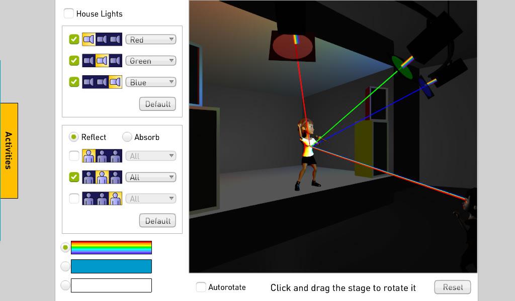 La couleur vous offre une scène virtuelle pour explorer les effets des lumières colorées sur les surfaces colorées. Vous l'utiliserez pour couvrir :