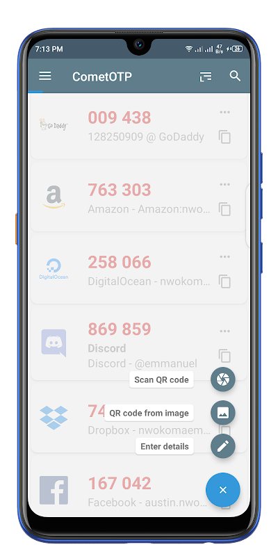 CometOTP vous permet d'ajouter une couche de sécurité supplémentaire pour vos comptes en ligne avec une authentification à deux facteurs (2FA). CometOTP met actuellement en œuvre et prend entièrement en charge les deux algorithmes d'authentification par mot de passe bien connus: l'algorithme de mot de passe unique basé sur le temps (TOTP) et l'algorithme de mot de passe unique basé sur HMAC (HOTP). Tout ce que vous avez à faire est de suivre la procédure de configuration de 2FA sur votre compte en ligne, d'utiliser CometOTP pour scanner ou importer le code QR et connectez-vous à votre compte en ligne avec le code à 6 chiffres généré par CometOTP comme couche supplémentaire pour protéger votre compte en ligne.