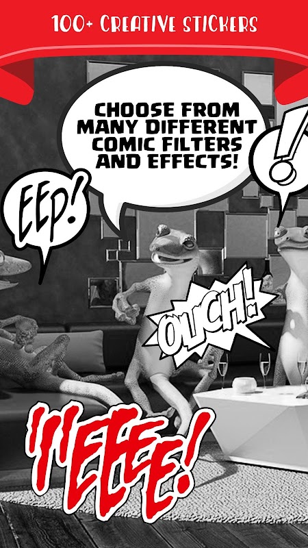- transform your pictures into autentic looking comics buy adding word balloons, stickers and filters to create