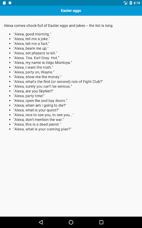 From this app, you will get full list of commands for your Echo Plus. All are organised by category. So you can find easily any command you need.