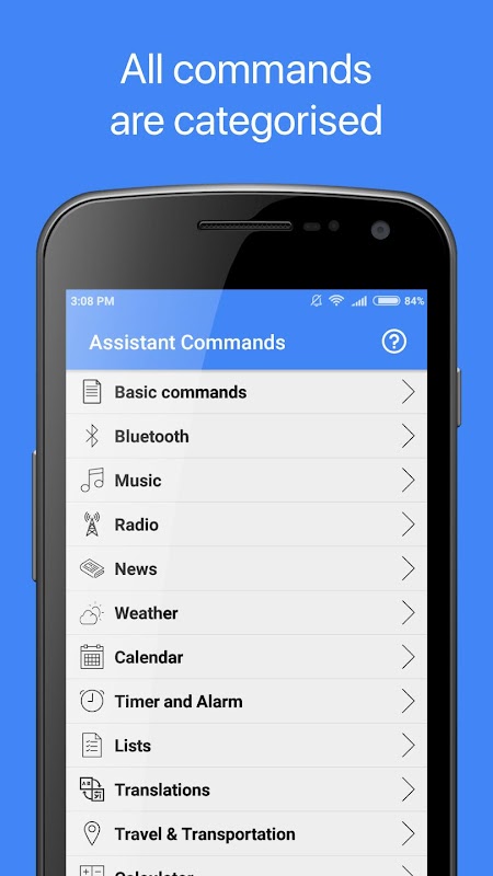 Cette application fournit une liste complète des commandes vocales pour Google Assistant et les haut-parleurs intelligents Google Home qui s'activent par une phrase spéciale Ok Google ou Hey Google. Toutes les commandes vocales sont catégorisées.