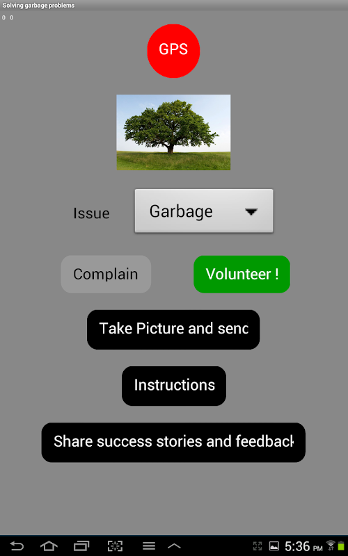 Become a superhero and create awareness about garbage or other problems in your community! Switch on GPS before opening app. The App opens camera as soon as you click on it (this saves time and adds versatility to capture issues like traffic violations immediately). Take the picture and save it. Then, wait for the GPS to calibarate and for the GPS button to turn green. In the mean time select the issue from dropdown menu and mode of action by clicking on complain or volunteer. Once the GPS is locked, the app automatically allows you to share a preset message, location and image through social media. You can choose any social option but emailing might be simpler. You can also change the preset custom message. Hopefully, this will take us one step towards a cleaner future! :)
