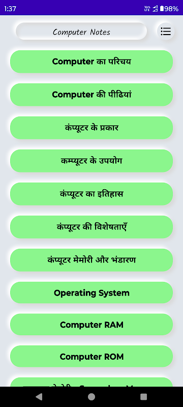 Cette application explique très clairement tout le concept informatique. Il contient des notes pour la préparation des concours tels que l'examen d'enseignant BPSC TRE, l'examen ferroviaire, l'examen bancaire, les examens SSC CGL, NTPC, Police, JSSC, BSSC, SSC.