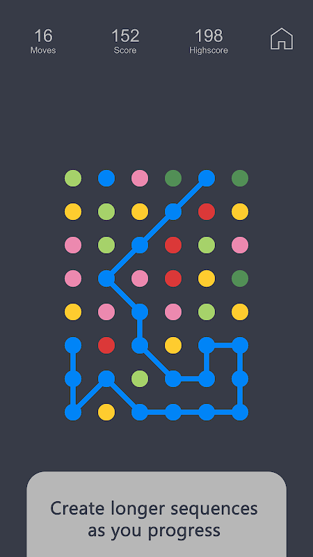 Accumulez des points en reliant des points de la même couleur les uns aux autres. Chaque point de la ligne connectée vous donne un point. Vous disposez de 20 coups au début de la partie. Pour obtenir plus de mouvements, connectez quatre points ou plus dans un polygone fermé. Chaque point du polygone vous donne un coup. Le jeu se termine lorsque vous n'avez plus de mouvements. Ne vous inquiétez pas, vous pouvez toujours recommencer en utilisant le bouton Redémarrer.