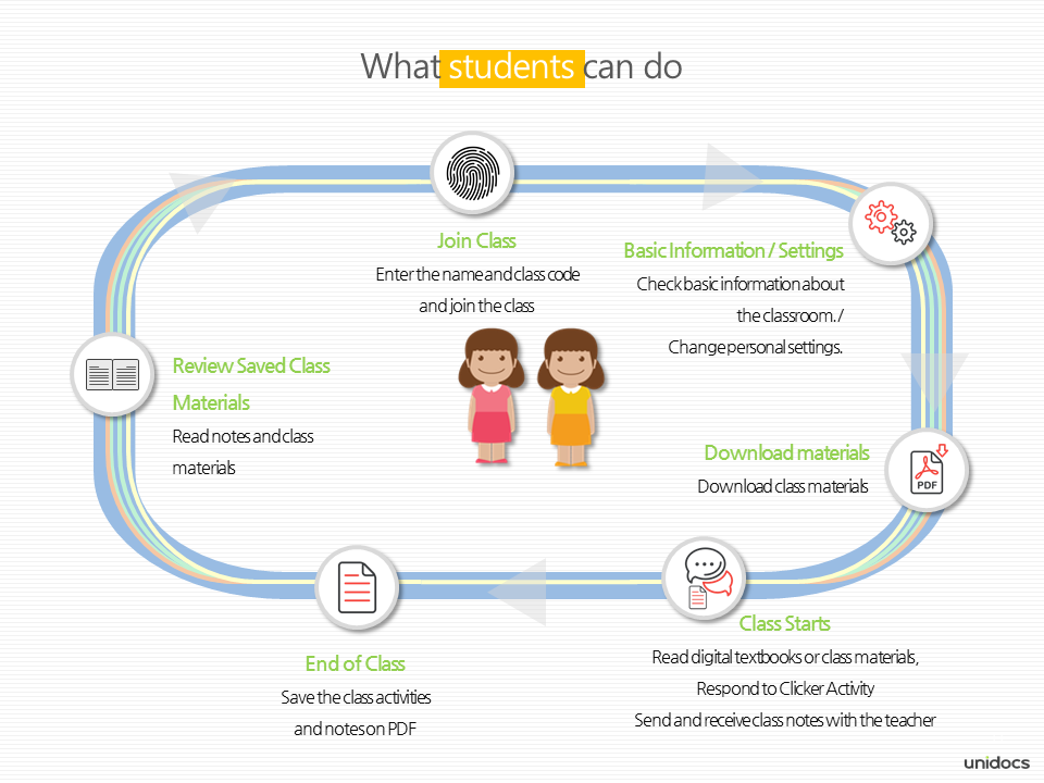 Teacher and students can highlight/underline important sections and write memos on PDF class materials.