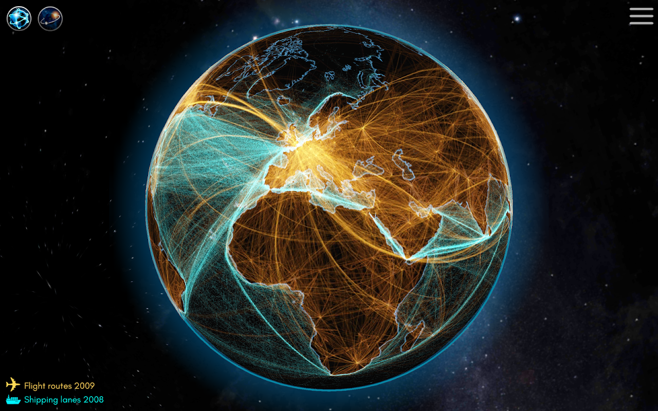 La planète Terre est relié par de nombreuses façons. L'expérience connexité dans une perspective globale. les routes, les chemins de fer, recouvrement des rivières navigables, routes maritimes et les itinéraires de vol pour savoir comment nous déplacer à travers le monde. Mélanger la couche de connexion Internet pour voir les câbles sous-marins et la façon dont les zones peuplées du monde interagissent les uns avec les autres.