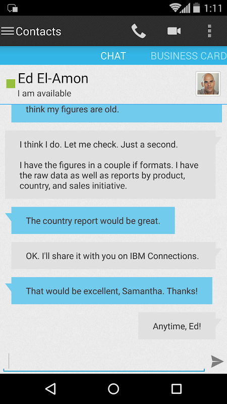 Connections Chat brings to market new and exciting capabilities to give you access to your people networks from the comfort of your smartphone or tablet. Connections Chat follows on Sametime's footsteps to help you accelerate your business processes, improve decision making and, ultimately, help you make the leap to the new way to work. Connections Chat works with your Sametime 9 infrastructure and features built-in integration with Connections Cloud family of offerings.