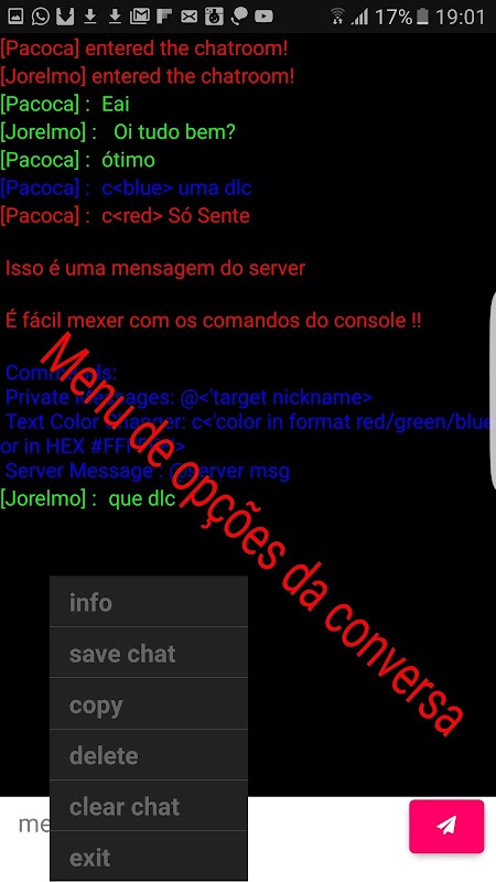 Ele propõe comunicação instantanea em grupo apartir de um console onde o usuário pode escrever mensagens instantâneas além de códigos para tornar a conversa mais interativa.