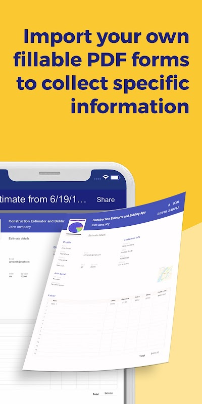• Récupérez les formulaires PDF des estimations et partagez-les par e-mail, Facebook, lecteurs réseau et autres options de partage disponibles sur l'appareil