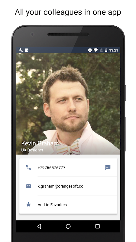 Contacter — private contact book of your company. Up-to-date staff contacts are just a touch away. Phone numbers, names, positions, emails — everything you need is now in your pocket.
