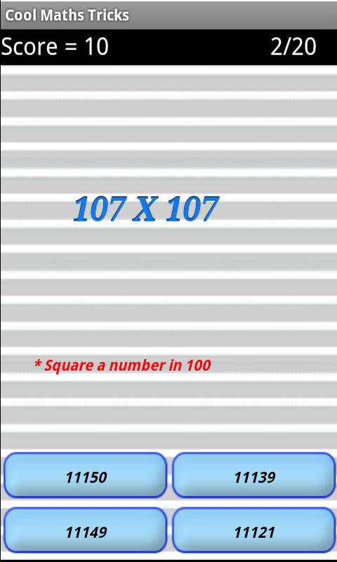Cool Maths Tricks that help you multiply, divide, subtract and square at lightning fast speed. Learn and practice the tricks of Vedic math calculation in a fun and engaging application. Study any of the math tricks and then practice them through the quiz.