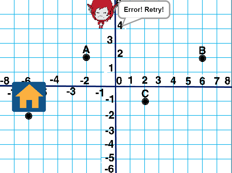 This is a game about Coordinate Plane. The student tries to help Nick (Assistant in game) to find the way back home. The player must find the correct coordinates, in order to find the way to his house.The game starts and the student sees 3 points A,B,C and the Home, Nick have to pass all the points with this order and finally arrives in Home. In total, we have 4 points(in random choice) in 4 quadrants. Nick asks for the coordinates of each point. If the player writes the right coordinates, then Nick walks(animation) to the next point, if not the assistant says <> and this is repeated so many times as the written coordinates is wrong. Every right pair of coordinates takes 1 point, every wrong pair of coordinates take 0 points. Finally, when Nick arrives in home goes to start and a new route form in the display, so he tries again to find the right pairs of coordinates for each point. Finally Nick announces the grade of the student. This is a funny game which reinforces skills in finding coordinates. With this game student practice coordinates on 4 quadrant grid. We believe this game is a useful teaching resource for Teachers, Parents and Kids.