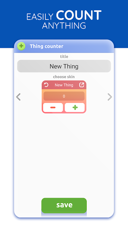 Compter n'a jamais été aussi facile. Vous pouvez maintenant avoir un outil de comptage spécial - un widget spécial qui compte les clics. Ce compteur de choses est une application de création de widgets. Cela signifie que vous pouvez créer un widget pour rendre votre comptage rapide et simple. Vous pouvez ajouter un élément en quelques étapes seulement: ajoutez un titre, choisissez un skin et, si vous le souhaitez, placez votre widget sur l'écran d'accueil. Vous pouvez modifier votre widget à tout moment, il suffit d'aller dans les paramètres de l'application et de renommer son titre ou de choisir un autre skin. Application conviviale, interface agréable, toutes les options nécessaires au comptage, sans boutons inutiles. Maintenant, vous pouvez facilement compter ce que vous voulez. Gardez une trace de tout ce qui est important pour vous. Avec cet outil gratuit, vous pouvez compter les clics comme un compteur de pointage. Comptez bisous, marches, pages, étoiles, boissons, tout ce que vous voulez avec ce Compte Sur Moi Widget - Compteur De Chose.