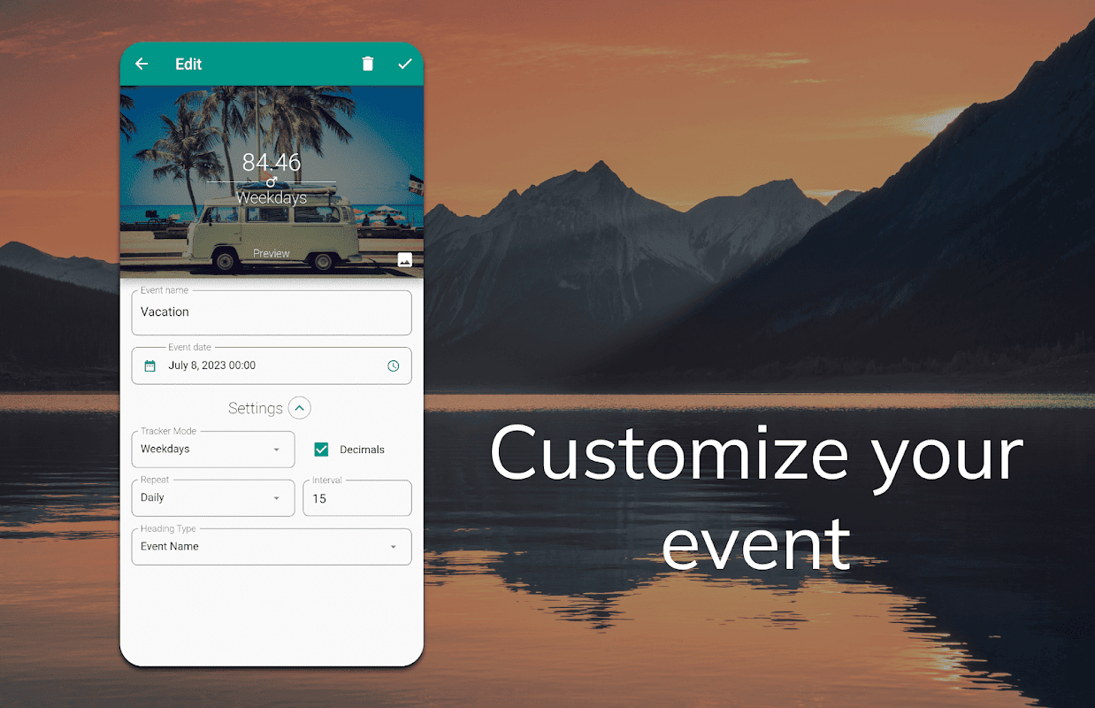 Utilisez-le pour un voyage de vacances, un voyage de vacances à l'étranger ou un anniversaire que vous ne pouvez pas oublier. Gardez une trace des grands jours comme Noël ou le réveillon du nouvel an. Les notifications quotidiennes vous tiendront au courant de vos événements et jalons tandis que le widget vous donne un aperçu instantané de votre date.