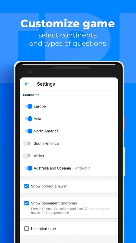 FLEXIBLE SETTINGS OF THE GAME: Customize gameplay as you want – select continents, types of questions and game parameters: unlimited time, display correct answer, etc.