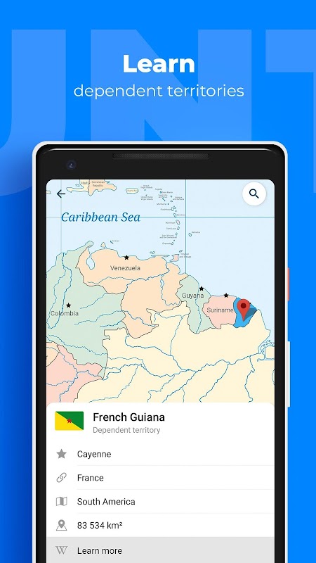 DEPENDENT TERRITORIES AND UNRECOGNIZED STATES: In addition to countries, 36 dependent territories and unrecognized states such as Greenland, French Guiana and Azad Kashmir are available in the app.