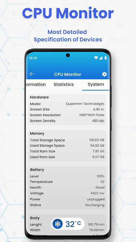 The most beautiful and powerful cpu monitor for android! You are able to monitor cpu temperature, usage, performance and frequency real time, and analyze the cpu temperature and frequency history data. Cpu monitor provides many kinds of tools. including: One Tap Boost, ram widget, cpu widget, battery widget, desktop floating window, status bar floating window, over heat alarm.