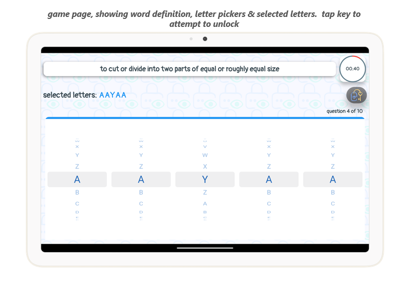 Au début de la partie, la définition d'un mot anglais s'affiche. À l'aide des cinq sélecteurs de lettres défilants, composez le mot correspondant à la définition.