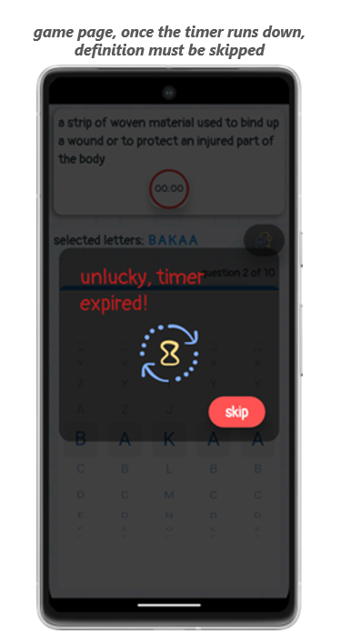 Vous pouvez tenter de deviner le mot correct autant de fois que vous le souhaitez, mais attention au compte à rebours ! Une fois le compte à rebours terminé (00:00), vous devrez passer à la définition suivante.