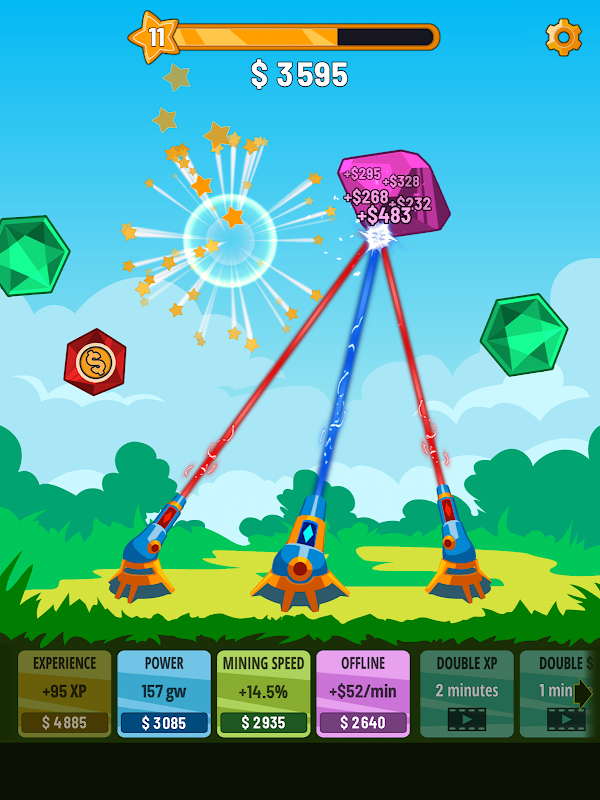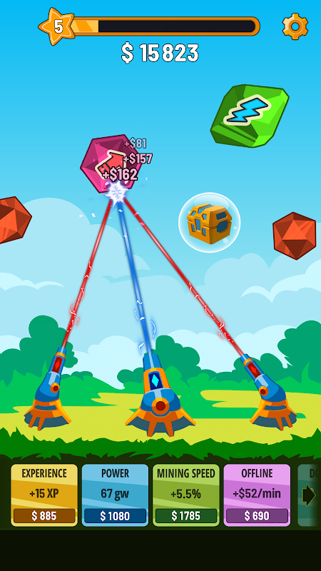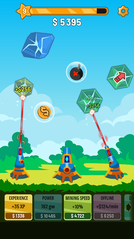 Upgrade your crystal cannons and idly watch them crushing and mining precious crystals – or take command yourself and swipe your biggest cannon to blast gems out and earn even more money!