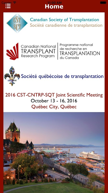 The Canadian Society of Transplantation (CST), Canadian National Transplant Research Program (CNTRP) and the Société Québécoise de Transplantation (SQT) are pleased to host the 2016 CST-CNTRP-SQT Joint Scientific Meeting in Québec City, Québec from October 13 to 16, 2016 at the Hilton Québec. This meeting will bring together members of CST, CNTRP, SQT and extended transplant community comprised of clinicians, researchers, pathologists, immunologists, basic scientists, allied health care colleagues, policy makers and many more for a highly educational and interactive scientific program on the latest topics related to organ donation and transplantation.