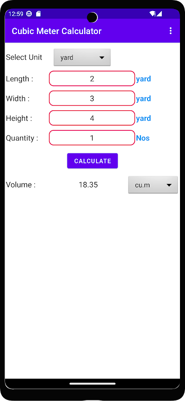 Cette application est utilisée pour calculer le volume en mètres cubes pour une longueur, une largeur et une hauteur données. Vous pouvez saisir la longueur, la largeur et la hauteur dans différentes unités comme le mètre, les pieds, les pouces, les mm, les cm, la cour, etc. et la réponse que vous obtiendrez en mètre cube, pied cube, cour cube, etc.