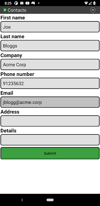 Les données saisies sont stockées dans une base de données sur votre téléphone et peuvent être partagées avec d'autres personnes en les envoyant par e-mail sous forme de fichier CSV compatible avec une feuille de calcul. Vous pouvez également exporter des données vers la mémoire interne de votre téléphone et importer des données à partir d'un fichier CSV tant que les noms de colonne correspondent aux noms de champs de votre formulaire.