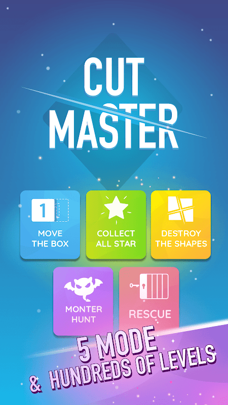 🎮You will discover 6 great game modes in the Cut Master: Move The Box, Collect All Stars, Destroy The Shapes, Monster Hunt, Rescue, Time Limit. Each game mode will have extremely interesting featured puzzles.