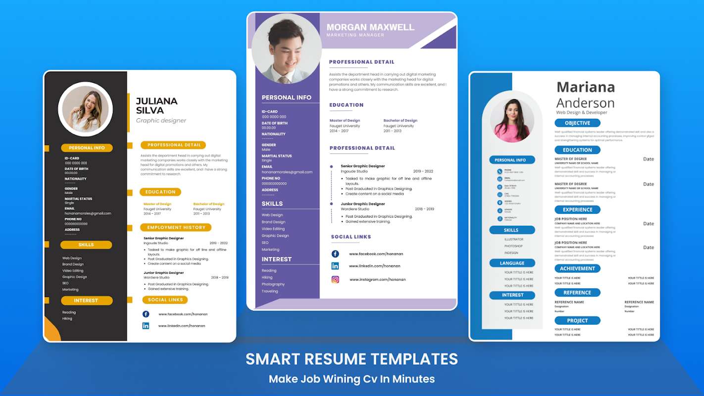 L'application de création de CV avec des modèles de CV professionnels et des modèles de CV basés sur des recherches actuelles dans diverses entreprises mondiales. L'application intelligente de création de CV peut changer les designs de CV dans n'importe quel format que vous choisissez, comme les formats de CV fonctionnel et combiné. Cela vous aidera à améliorer votre Curriculum Vitae en PDF pour obtenir de meilleures opportunités dans le monde entier.
