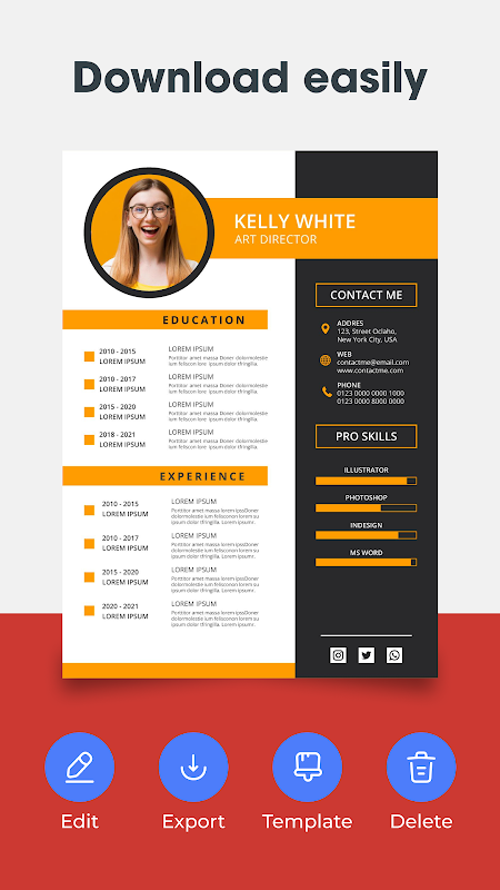 Après avoir créé votre CV, cette application vous permet de télécharger facilement votre CV au format PDF ou IMG, de stocker votre CV sur votre smartphone et de le partager facilement via une autre application. Utilisez cette application et commencez votre voyage de bâtisseur de carrière
